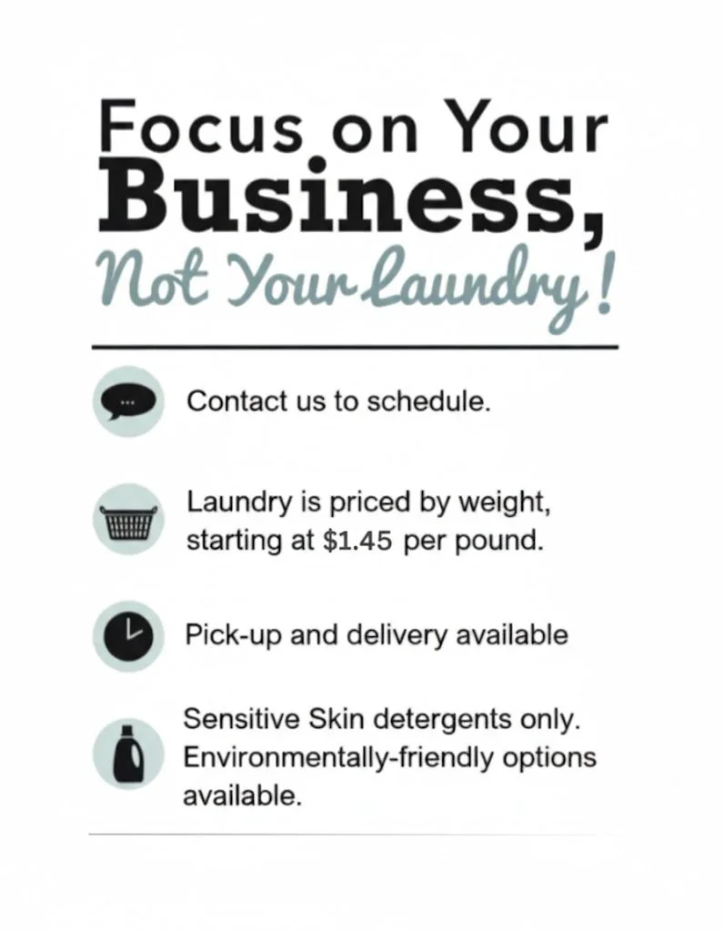 The commercial services are focused on sheets, towels, service uniforms, team uniforms, linens (no ironing), and other medical clinic items. Please do not send items that are precious, ‘dry clean only’, ‘hand wash only’, or are delicates that should not be washed. We are not responsible to ensure that proper items have been sent in the order.